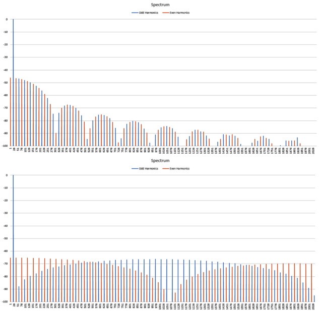 The question I posed was kind of a setup, because I knew the answer, but I wanted to see if anyone on this bulletin board knew, and to teach them a lesson after they had trashed my answer to another question where I listed the Bullard Laws of Harmonics. In this question I simply asked this: The top plot shows the spectrum from a peak clipping and the bottom plot shows the spectrum from a zero crossing distortion with exactly the same amount of distortion. Why do they look so different?
