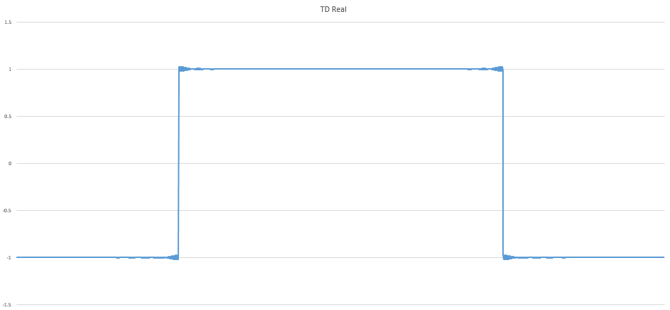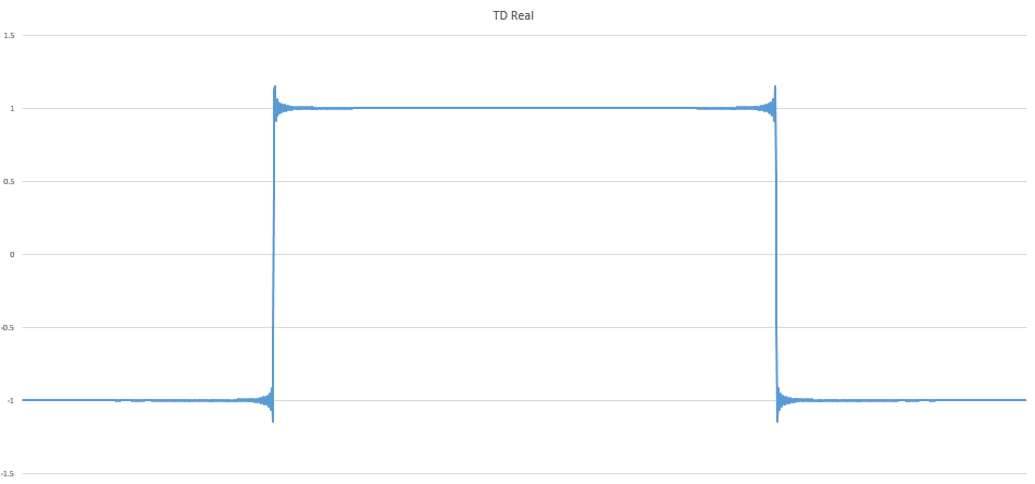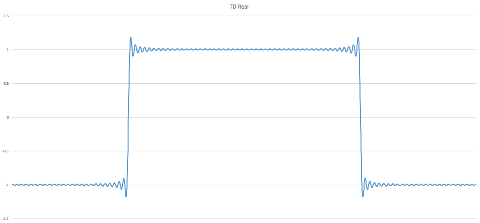 Here is a square wave made from the spectrum of a square wave through an inverse FFT. That is, I created a square wave in time domain, did an FFT on it, then removed all harmonics except the first 100. Then I did an inverse FFT and got this time domain wave.
