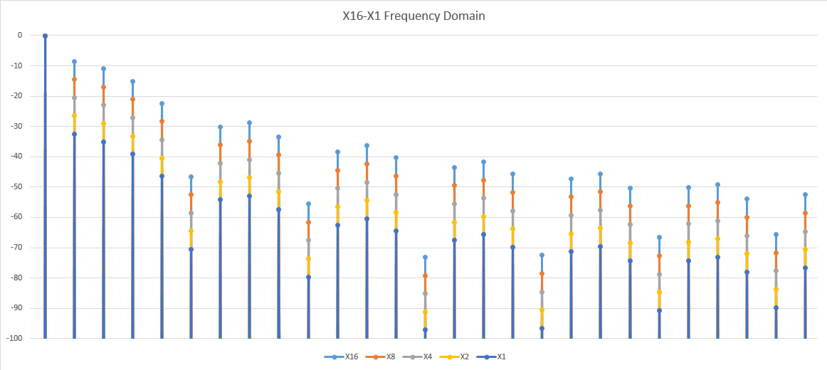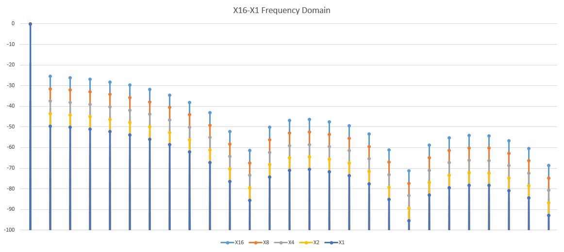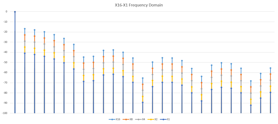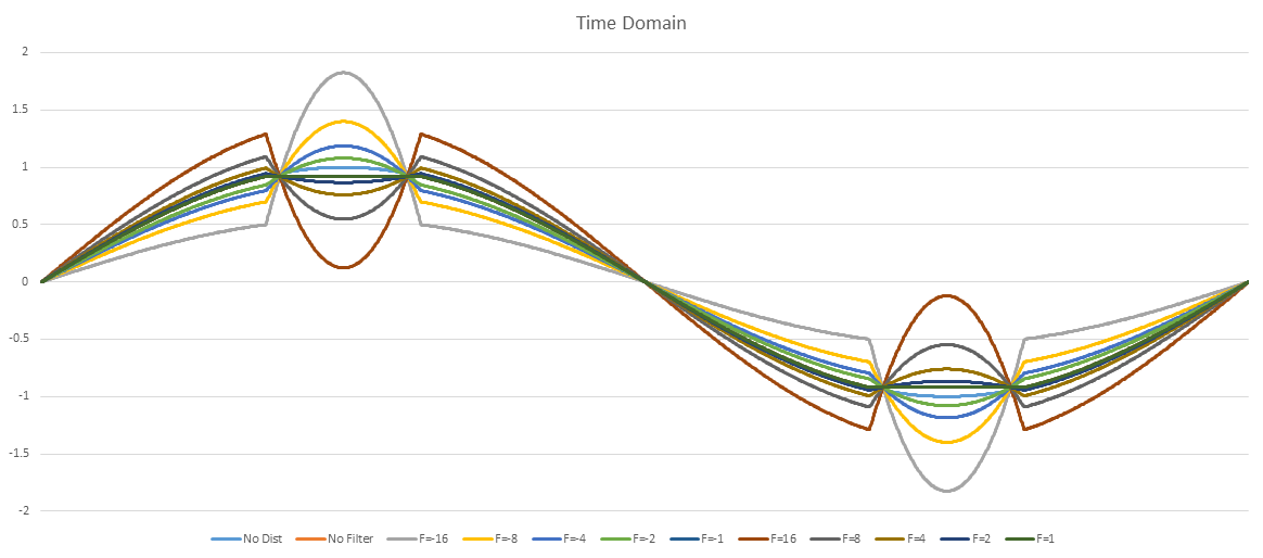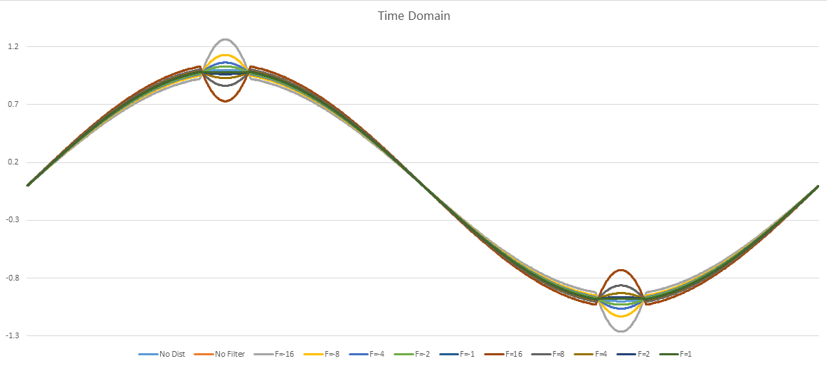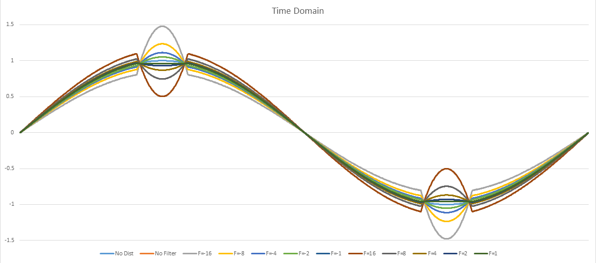 Count them, six humps, half of what I get if I include the aliases as I do in the book. And as I showed you before, each value is 6dB from the previous value because I vary the harmonic amplitude boost from 16 to 8 to 4 to 2 to 1. I don't need to show you the negative values of -16...-1 because, while impressive in the Time Domain, they are identical to the positive values in Frequency Domain because the only thing that changes is the phase, which I almost never show you anyway. So, 6dB for a doubling, which is expected. Now, let's chop off less of the peak and see what that wave looks like.
