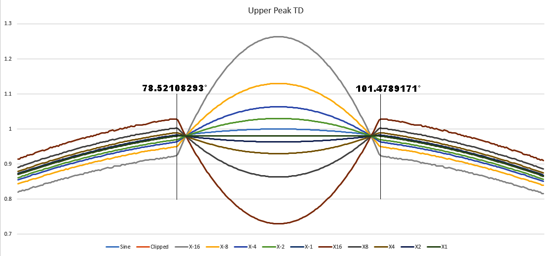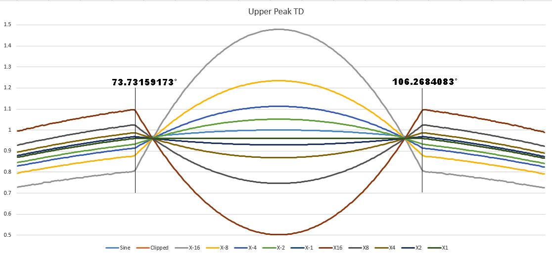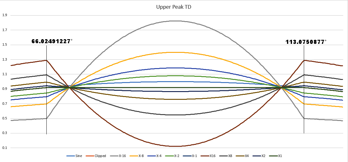 I've been having a good time using inverse FFTs to amplify the amplitudes of the harmonics of various distorted waves. In this case, I used my three favorite waves that I used in my book Distortion. In those examples, I clip the top and bottom of a sine wave at 0.9199919991999V (66.92491227°) and the complementary angle on the negative peak at -0.919991999V (246.9249123°) as well as two other waves clipping 0.959995999V (73.7389766°) and at 0.979997999V (78.52108293°), and of course their complementary angles to keep the Even harmonics at bay (according to Bullard Laws of Harmonics #3).