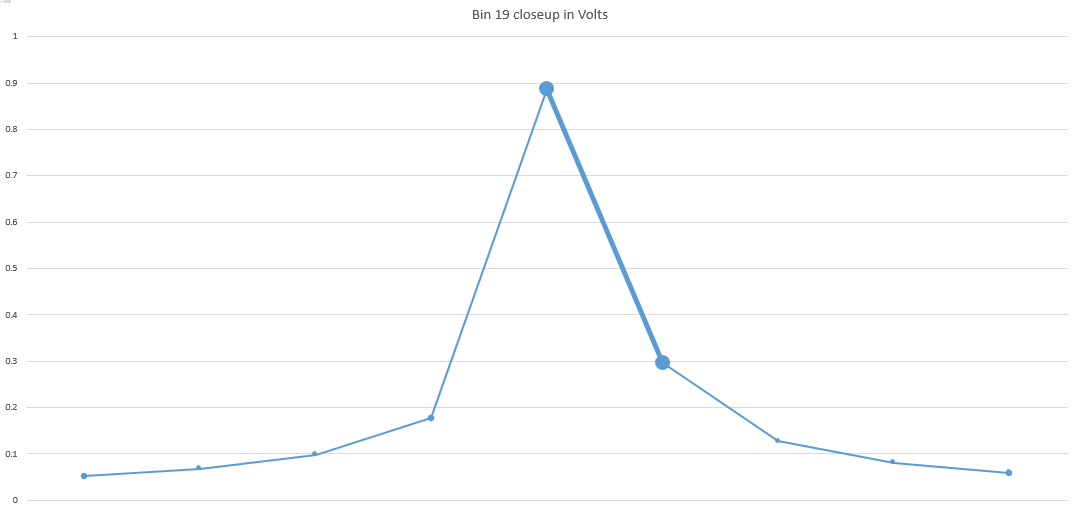 Where N is the number of samples captured. Now the left_bin and right_bin vary depending on which two of the three (center and the skirts) are bigger. In this case, the upper bin, bin 20 (aka Z62) is larger than bin 18 (aka Z60) meaning that we captured 19.xxx cycles of the wave, not 18.xxx cycles of the wave. That means that left_bin is 19. If bin 18 had been larger than bin 20, we would have used bin 18 for the left_bin and the largest signal, the fundamental would be the right_bin.