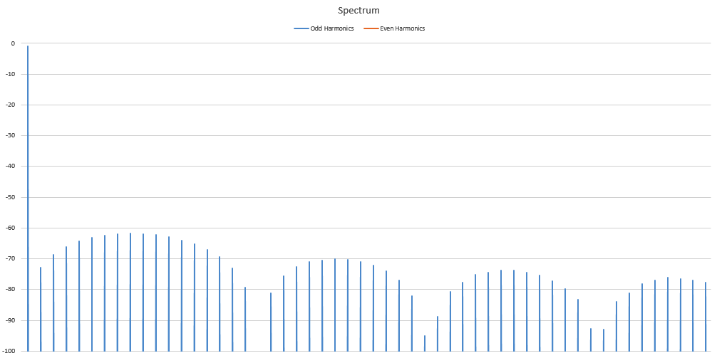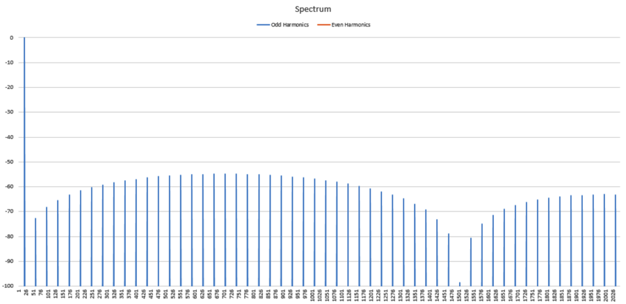 Only Odd harmonics that start low, then rise up out of the noise floor, hump over, then go back down to zero, then hump back over, and over and over. We have seen this before, have we not?