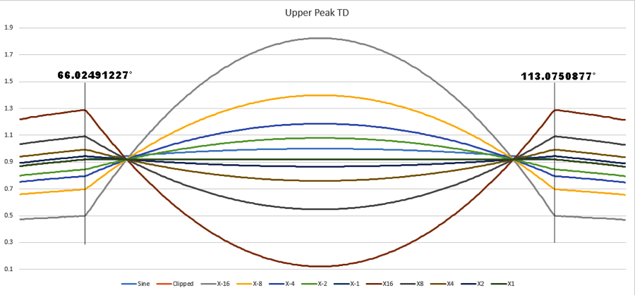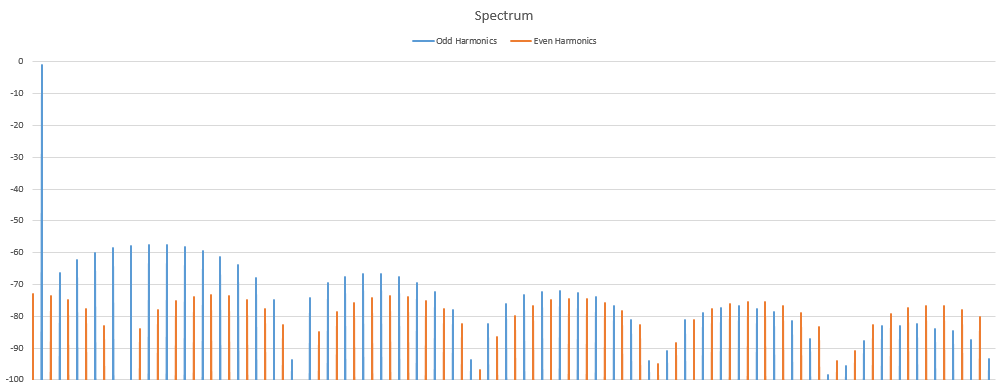 is one reason I find harmonics so interesting. Look at that harmonic signature! If there were any Even harmonics, they would start high near the fundamental, but because this distortion happens near the zero crossing, the Odd harmonics start low, then rise up out of the noise floor and then peak later. That is one of the biggest reasons why I named my first book Distortion: The Cause Of Harmonics And The Lie Of THD. THD is a lie, because most often nobody goes above the 9th harmonic. Follow me (by twos). The 3rd harmonic is -73dB, the 5th is -69dB, the 7th harmonic is -66dB and the 9th is -64dB. After that the harmonics continue to rise up to -63dB, -62dB, -62dB -61.7dB and then it starts humping downward again. But why are we ignoring all those values? They would significantly increase the THD if they were added in. Oh, well, there's the rub! That would make the THD look worse than it would if we just keep it down to only the first 8 harmonics. So counting above the 9th harmonic would make the device (amplifier, mux, etc) look bad, and we can't have that!