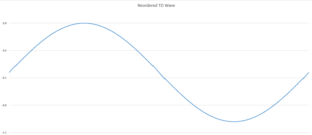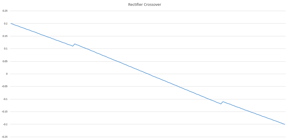 Dr. Surya Santoso, professor at the University of Texas at Austin wrote a book on the topic of power quality named Electrical Power Systems Quality. I have been referred to this book over and over again in various online articles and posters on Quora to explain how harmonics are created from harmonic currents (shudder again!). Very often, the articles talk about florescent lights, motors and rectifiers causing harmonic currents, which in turn causes harmonic voltages. I realized that I could easily simulate the effect of an analog full wave rectifier from the perspective of a load. What I did was to knock the transfer function down to 0.9 all the way from -1.0 to -0.12, then I left it at 1.0 all the way to +1.2 where I went back to 0.9 for the rest of the transfer function all the way to +1.0. This simulates having a power supply with a 17:1 transformer that puts out a maximum of 10V peak, which is then applied to a standard full wave bridge rectifier which would remove a total of 1.2 volts (0.6V on each leg) reducing the voltage to about 8.8 volts peak. By programming the transfer function down to 0.9 for most of the transfer function I am assuming that the current draw of the circuitry attached to the power supply pulls the power voltage down by 10% while the diodes are conducting, and are not pulling anything when the diodes are not conducting, which should make sense.