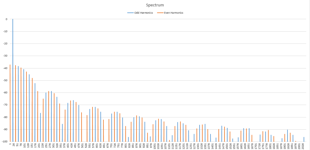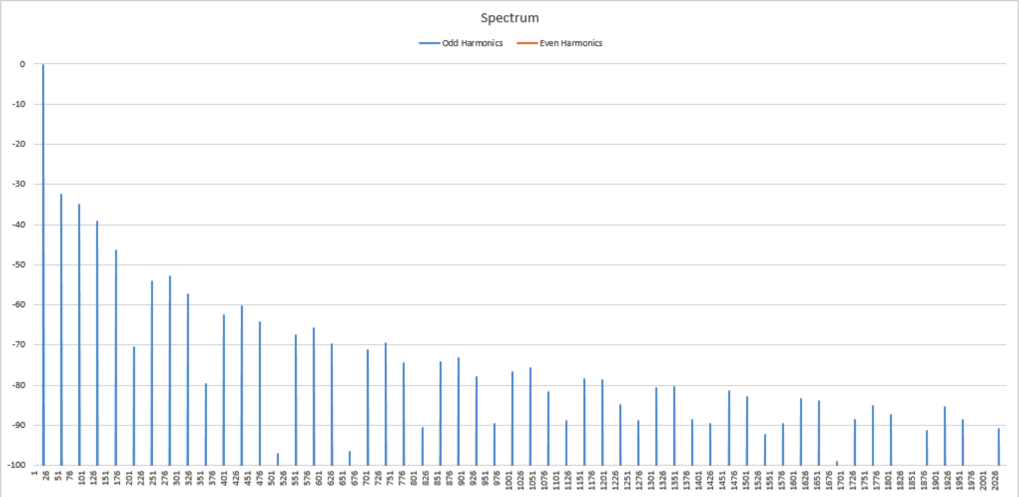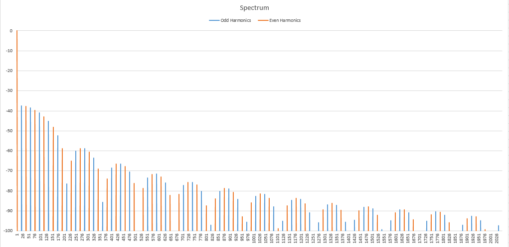 Yep, exactly the same pattern we saw above (but a little harder to make out because of the missing Even harmonics) but also notice that in addition to the Even harmonics being totally gone, the Odd harmonics are twice as big as they were before. Again, the 3rd harmonic in all the spectra above is around -38dB, but in this one the 3rd harmonic is exactly 6.02dB higher at -32dB. EXACTLY. In fact, every single Odd harmonic is exactly 6.02dB taller than they were in all the other spectra above this one. And why is that? Because the phases dictated that the amplitudes would be additive, but in the case of the Even harmonics, the phases dictated that the amplitudes would be subtractive, and so the amplitudes of the Even harmonics created by the positive peak clipping subtracted from the Even harmonics created by the negative peak clipping. Hence, every single Even harmonic is totally cancelled, which yields Bullard Laws of Harmonics #3: