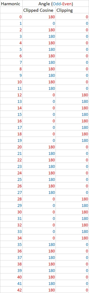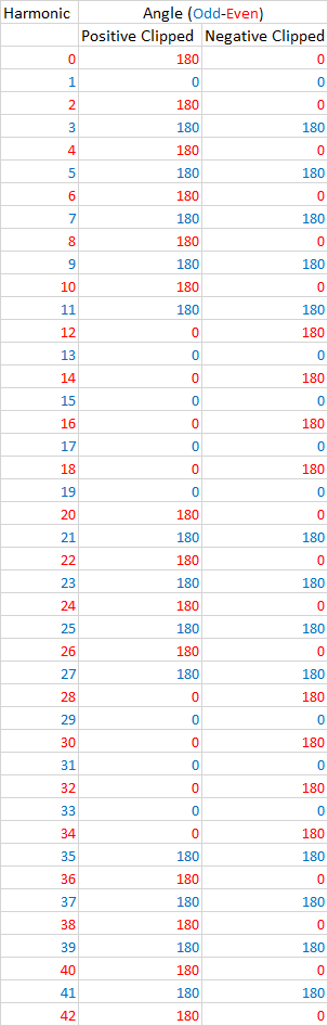 Notice that, like I said, the positive clipped wave has 180 degrees in bin 0, the DC offset bin, whereas the negative clipped wave has a 0 degree offset in bin 0. But follow it down. Notice that the positive clipped pattern is easy to follow, ten 180s, then eight 0s, then eight 180s, then seven 0s, and so on. But the negative clipped wave has an odder, harder to follow pattern. Why? Because the Even (red) harmonics of the negative clipped wave are the opposite phase of the corresponding positive clipped wave harmonics. Follow it down. Notice that the Odd (blue) harmonics exactly match in both columns, but the Even harmonics are exactly opposite by 180 degrees.
