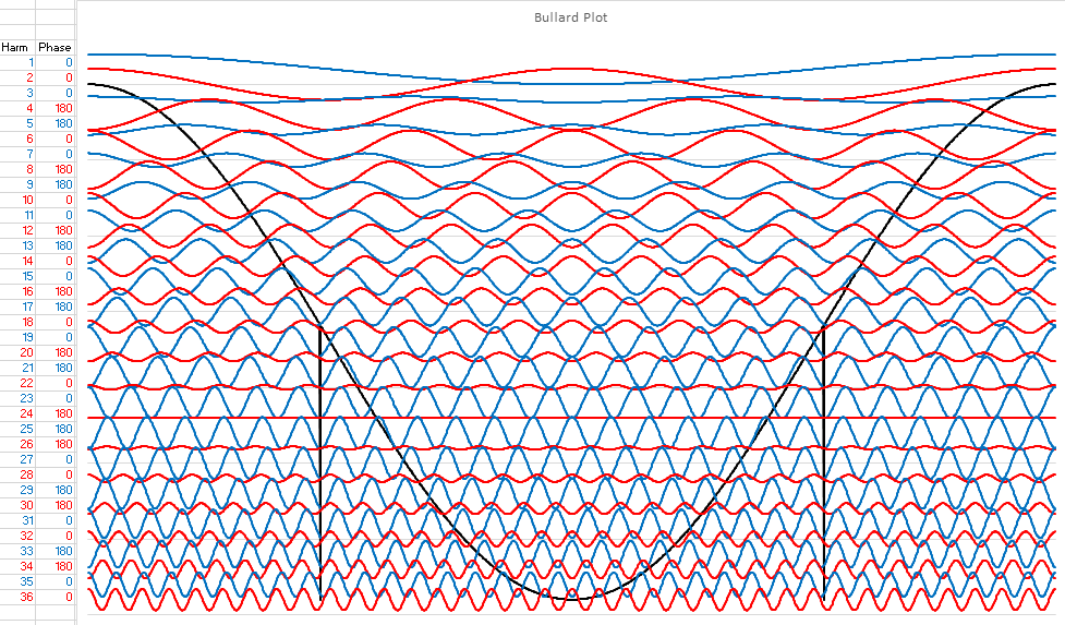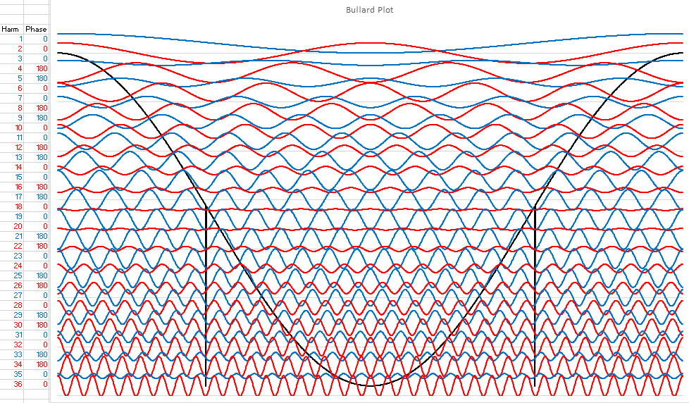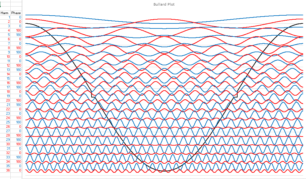 You can see in the center of the wave, right near the zero crossing is a nasty distortion, and you can also see how the harmonics conspire to cause that distortion to happen where it does. On the far left you see, in my normal color code, the phases of the harmonics. This is a fun pattern with the fundamental at 0 degrees (always) then 0, 0, 180, 180, 0, 0, 180, 180, 0, 0, 180, 180, 0, 0, 180, 180, 0, 0, 180, 180, 0, 0, 180, 180, 0, 0, 180, 180, 180, (that was the 30th harmonic in case you lost count), 0, 0, 180, 180, 0, 0. Notice that they follow Daver's Law, that all the harmonic phases of a distorted cosine wave are either 0 or 180 degrees. This was derived from Law #5 of Bullard Laws of Harmonics, but since that specifies that there are four possible phases of a sine wave, it's actually easier to deal with cosine waves, as you now have only two values to worry about instead of four.
