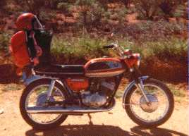 This is 1968 Suzuki T305 that I had shipped over to Australia. It was given to my by my father who rode it for a few years. It is a two cylinder two stroke with oil injection, six speed transmission and dual leading shoe front brake. Pretty hot stuff for the time. This was my only source of transportation on the Northwest Cape. All of my friends had bikes (including my wife April) and we travelled all over the Cape together. Here I'm on an outback camping trip.