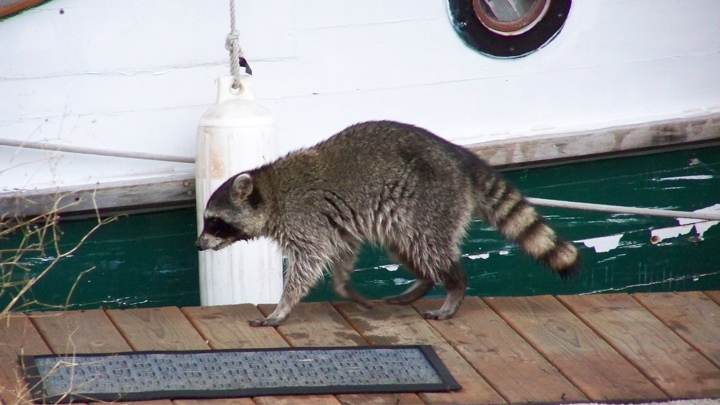 On the first day we had our first visitor, a racoon found something to eat right next to our boat. He wasn't afraid of us at all, but he never did come back.