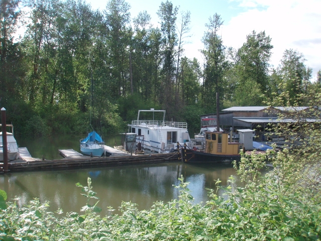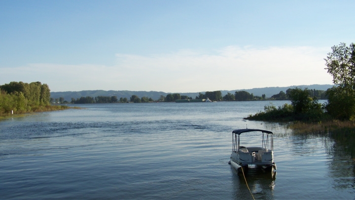 We decided to go on to Hadley's Landing in Multnomah Channel as anchoring in front of Caterpillar Island overnight has too many risks (high winds and big ship wakes). On the way we passed the South end of Sauvie Island, here you can see a nice shot of the island and the West Hills behind the island. It's these hills, thrust up by volcanic forces that detours the Columbia from it's westward journey to the Pacific Ocean northward for over 30 miles.