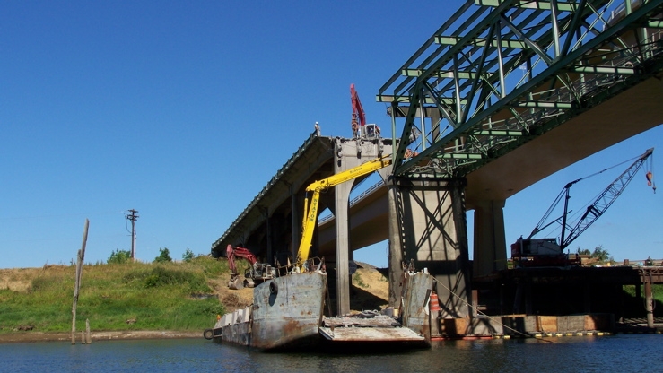 As we passed under the new Sauvie Island Bridge we watched crews take down the old bridge. Here you can see two articulated jack-hammer devices (the yellow and red things in this picture) chiseling away at the bridge footings. Five days later, just minutes before we passed under again to go home, the red machine and it's operator tumbled off the bridge onto Sauvie Island. That morning, as we approached the bridge we noticed fire trucks coming across the new bridge to respond to the accident, but at the time had no idea what was going on. Only later did we hear about the accident on the radio.