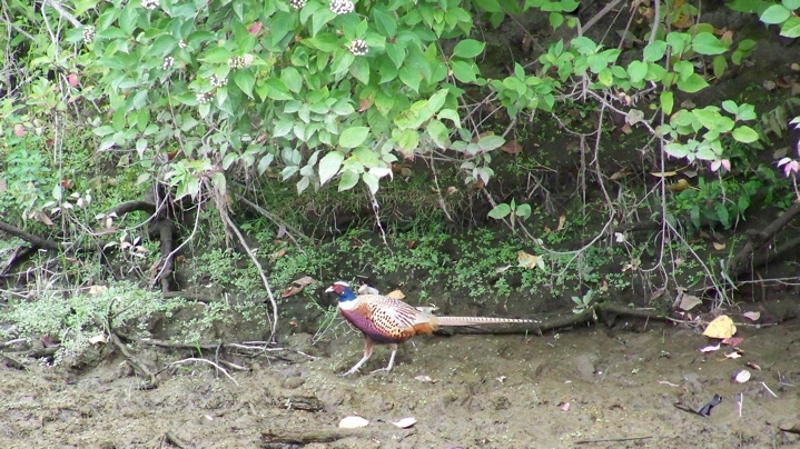 Since we live right next to the Shillapoo (Shallow Pool) Lake wildlife refuge we get to see an interesting phenomenon this time every year. Washington State releases pheasants for the hunters, which then end up all over the road, the island and the parking areas in addition to the marshes and fields where they belong. Usually on Saturday mornings we are awoken to the sound of shotguns going off. Since no regular guns are allowed we have little to fear from the blasts, except the occasional rain of steel pellets hitting the roof.