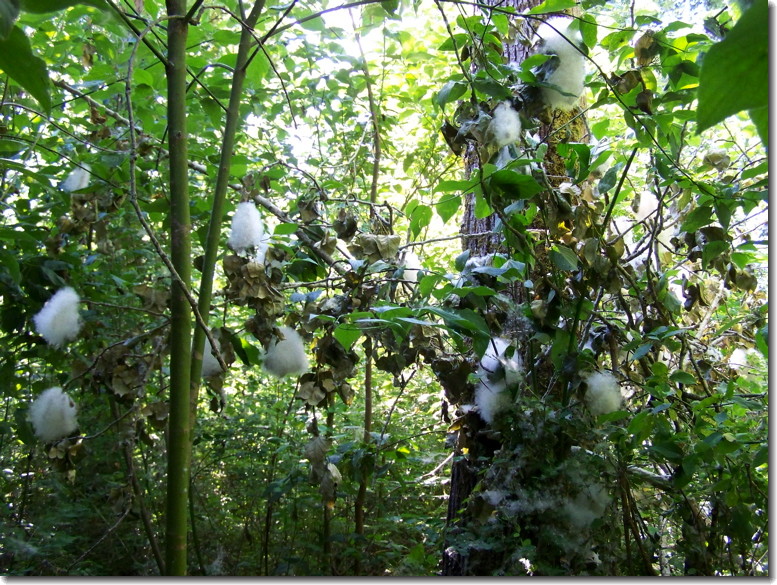 Now that the water is a little lower we are seeing strange things. When the water was up algae mats grew between branches of the plants, but as the water drops, the algae is left "hanging". It looks like paper draped over every bush! April calls it "laundry day in the swamp".