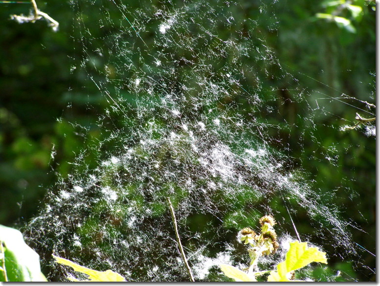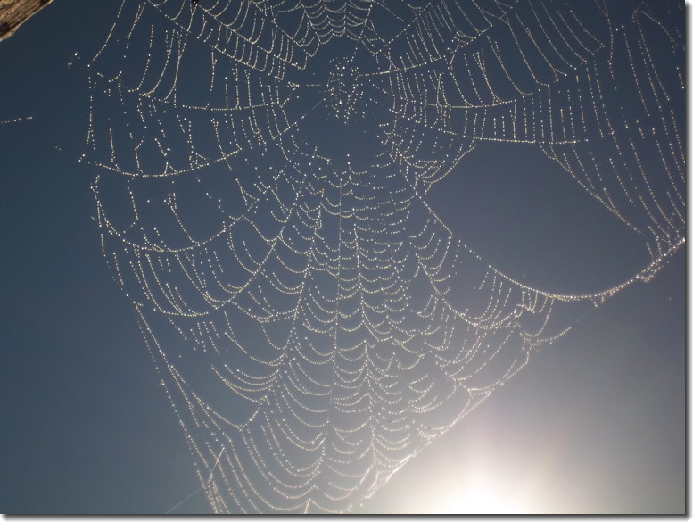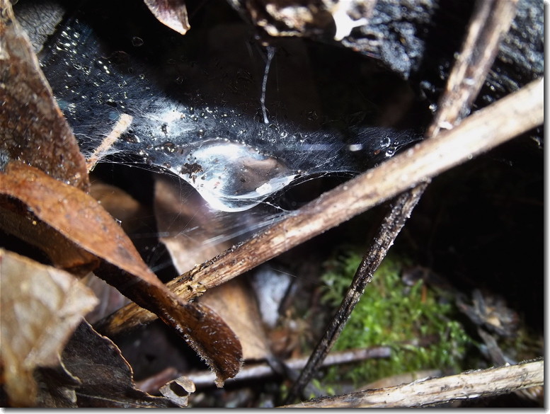 A spider built a swimming pool! The fine silk holds the rain water which balloons out the bottom of this structure. Amazing! Click on the photos to see even more detail.