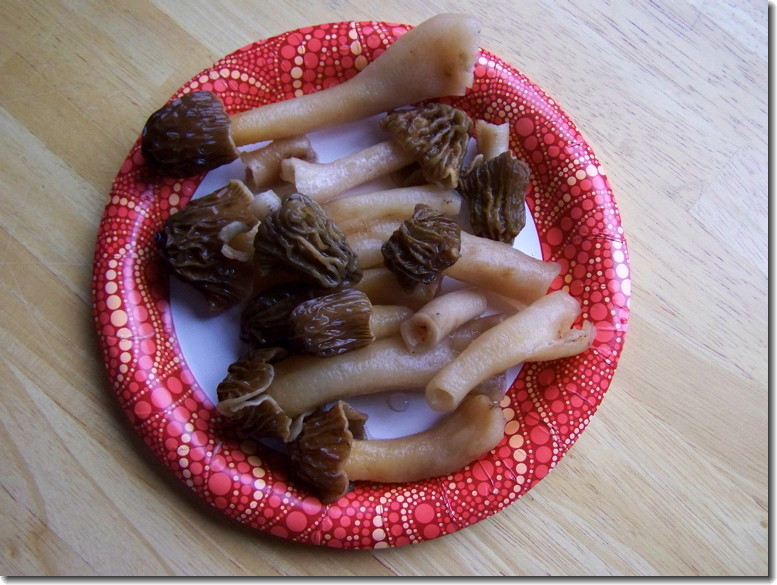 At first when I found these in the forest I was pretty excited, oh boy, Morels! But then I did a little research. These are actually Verpa bohemica, a variety of False Morel. They are easily distinguished becasue the bottom of the caps are not attached to the stem. True Morels have a cap that is fully attached to the stem at the bottom. False morels can be eaten by some people if cooked very well, but they are not safe by any means. They can cause stomach aches, partial muscle paralysis and even coma.