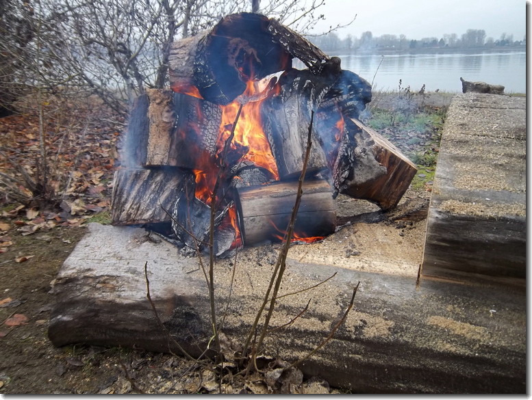 It was a cold morning so when I went out to check on the fire this is what I saw. Notice that the wood is nearly gone and that the area around the fire is the only frost free area in view. Fire will do that for you!