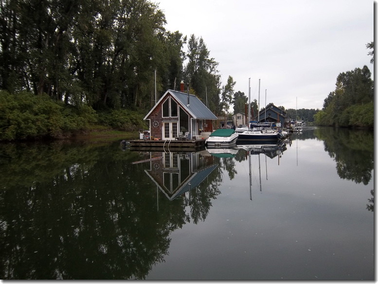 On my first free Tuesday after giving up my volunteer job at the Vancouver Library I took Lil' Ambition around Bachelor Island to Felida to have it ready for taking Great Ambition on the same journey tomorrow (albeit a bit slower). This is the Ridefield Moorage and a cute little house.
