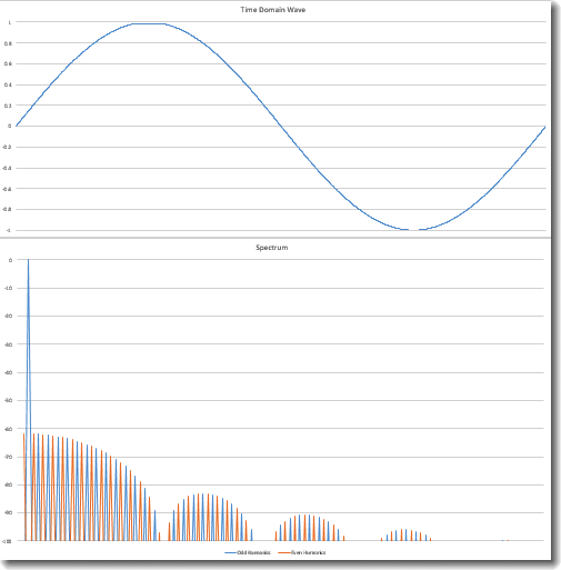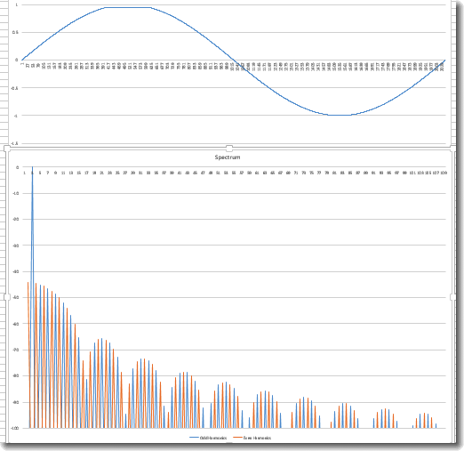 Now hit OK and acknowledge that you want to overwrite the data in the Complex array. In a few minutes (it's slow, OK) you will see the spectrum in the chart marked as such. Now try corrupting the sine wave. For example, you can clip the top of the wave off by doing a Copy on cell B415, then select cells B415 through B615 and doing a Paste Special->Values (the picture of a clipboard with the text 123 in the icon). That will set 201 samples to 0.95330604, which will be visible in the Time Domain Wave chart. Now do the FFT and look at the harmonics created by the clipping.